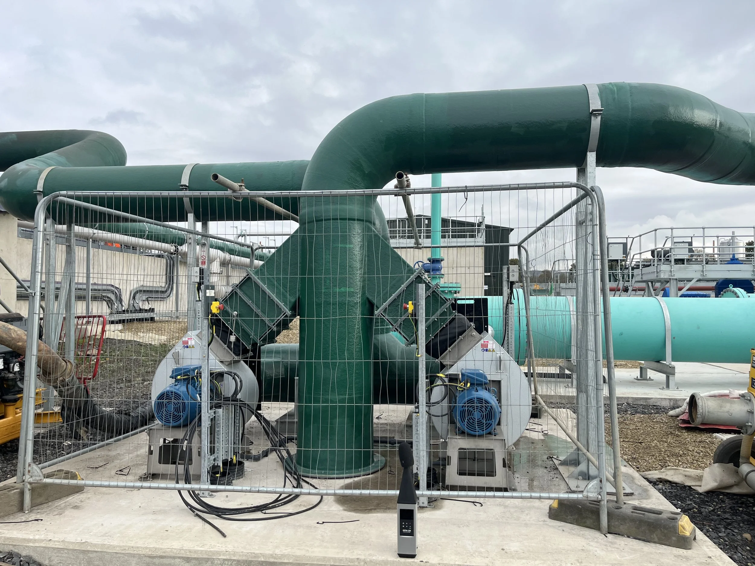 The PST plays a critical role in treating wastewater, as it acts to remove solids and suspended particles in the effluent. A long arm rotates within the wastewater at a rate of approximately forty-five minutes per rotation to stir the wastewater, and any solids sink to the bottom. From here, the solids are pumped out from the bottom of the tank using a Primary Desludging Pump which moves them to a separate structure for repurposing into fertiliser. Finally, and uniquely for this PST, a plastic composite hood had been added to cover the PST in order to trap any odours to stop it being unpleasant for the nearby cottage. These odours and gases needed to be transported away from the PST, so a large duct of around one-hundred metres fed into the top of the hood. This odour extraction was then driven by two large extract fans, with one operating as a redundancy for the other.